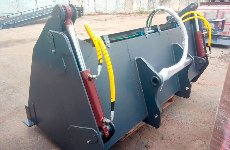 Такой ковш является самым универсальным видом навесного оборудования на телескопический погрузчик, при условии что данный погрузчик работает на строительной площадке. Подвижная челюсть позволяет трансформировать ковш в бульдозерный отвал, грейфер, захват и планировочное устройство. Основным назначением ковша является погрузка и перемещение грунта, выравнивание (планирование грунта), перемещение крупногабаритных грузов, погрузка грейфером.