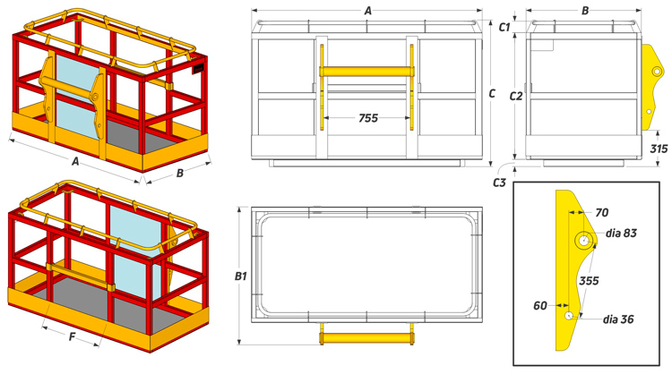 ВНИМАНИЕ! На чертеже представлено навесное оборудование в 4 вариантах с креплением от телескопического погрузчика MANITOU. При изготовлении данного оборудования с другим креплением, внешний вид и габаритные размеры оборудования могут измениться.
